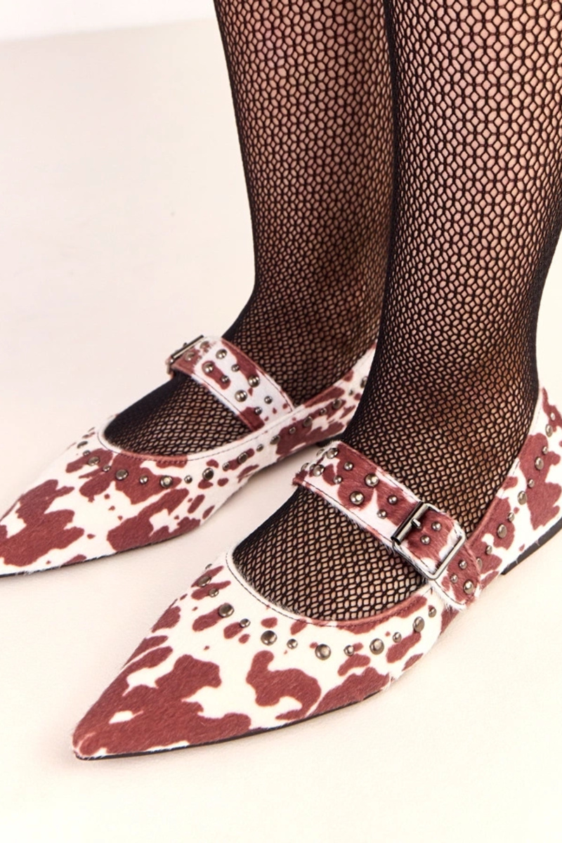 Braune Ballerinas Loresi im Kuhfleckenmuster, dekoriert mit Nieten