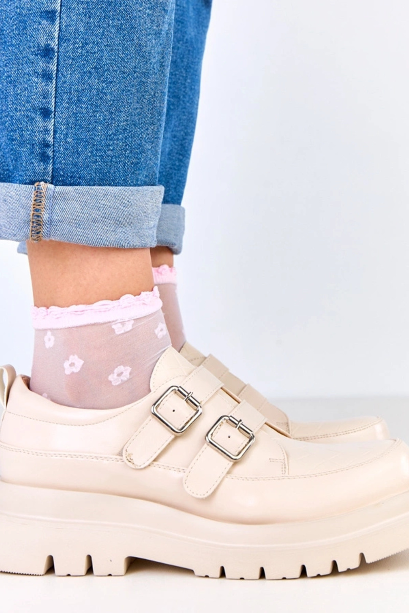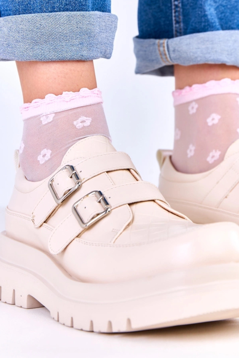 Beige Halbstiefel auf massiver Sohle, dekoriert mit Schnallen, Juke