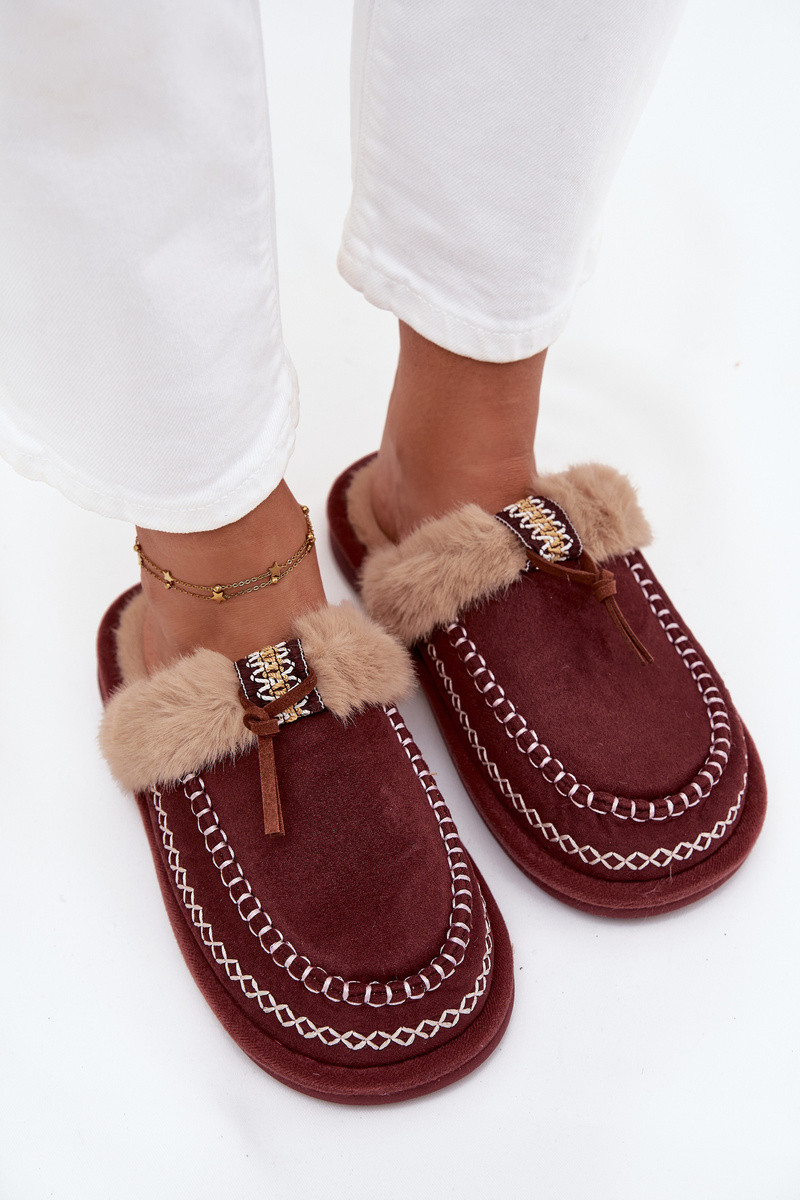 Damen bordeauxfarbene Hausschuhe mit Fell und Stickerei Perivelle
