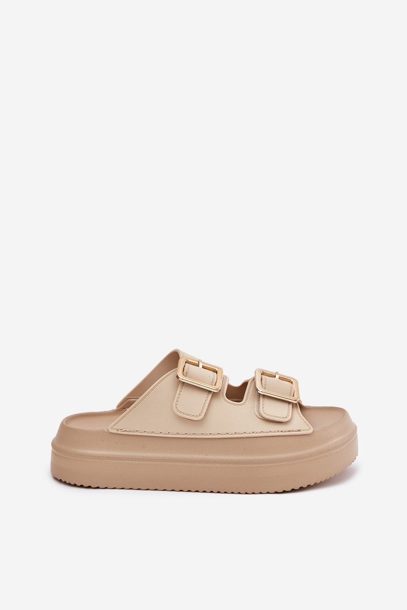 Damen Slipper mit Plateau und goldenen Schnallen, sandfarben