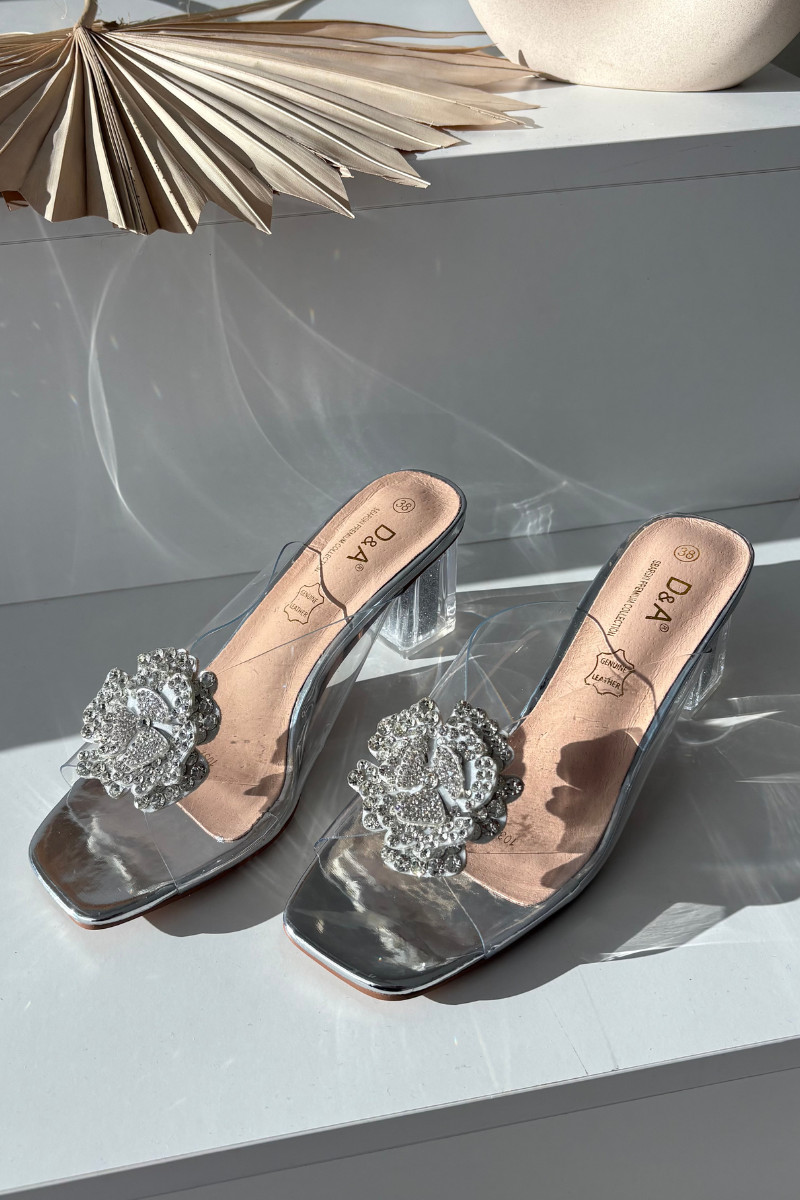 Silberne transparente Hausschuhe D&A MR1037-20 mit Absatz und Ornamenten
