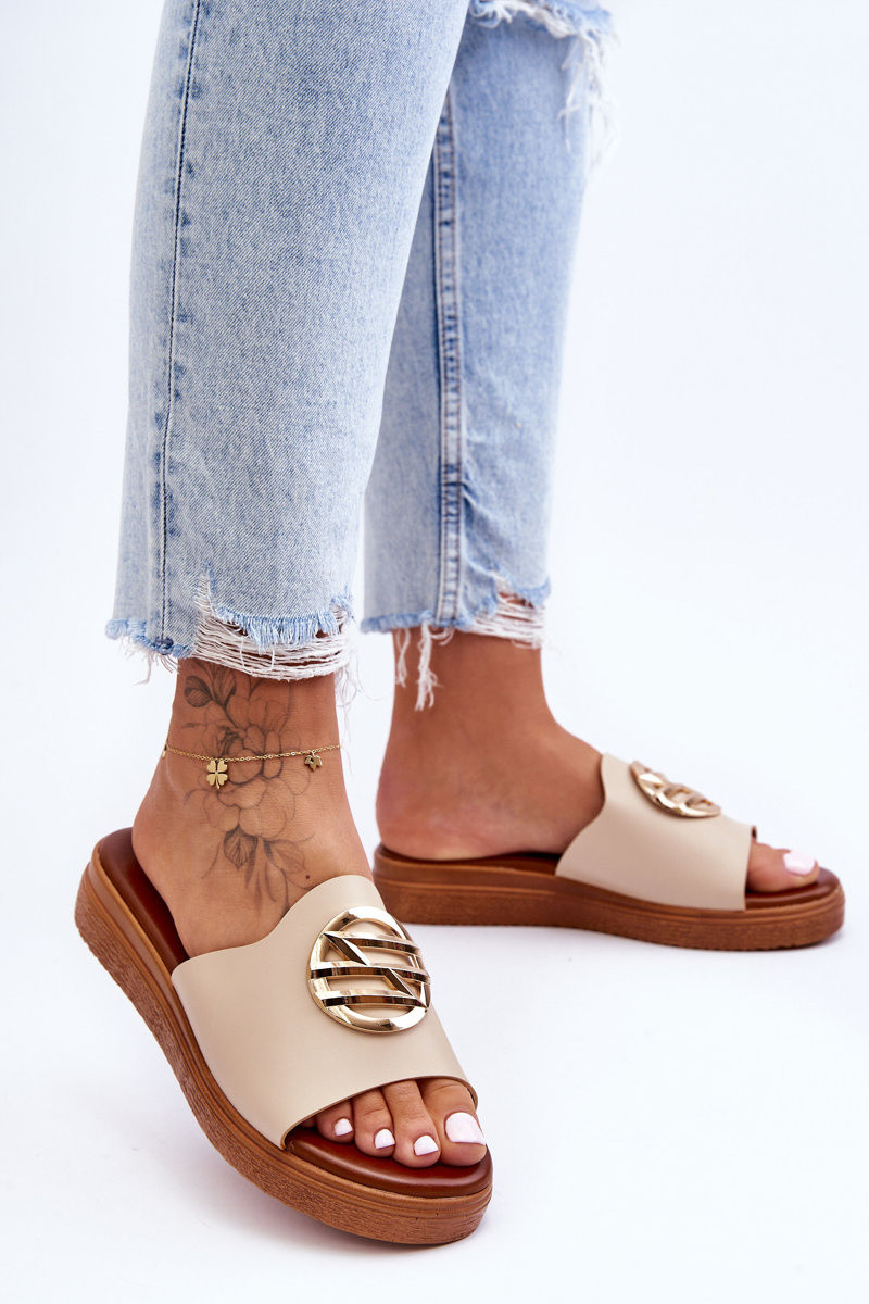 Damen sandfarbene Pantoletten mit Ornamenten „Secrets"