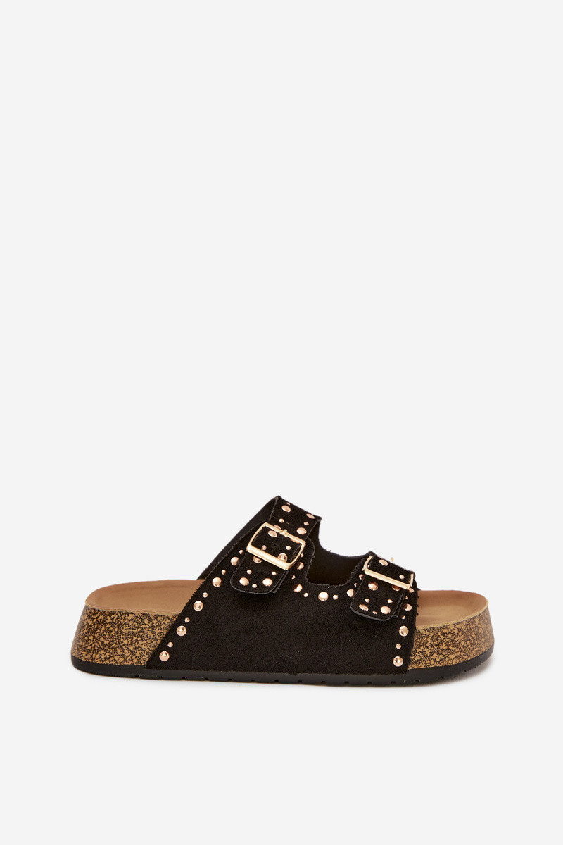 Damen schwarze Pantoletten mit goldfarbenen Schnallen und Nieten Tervina
