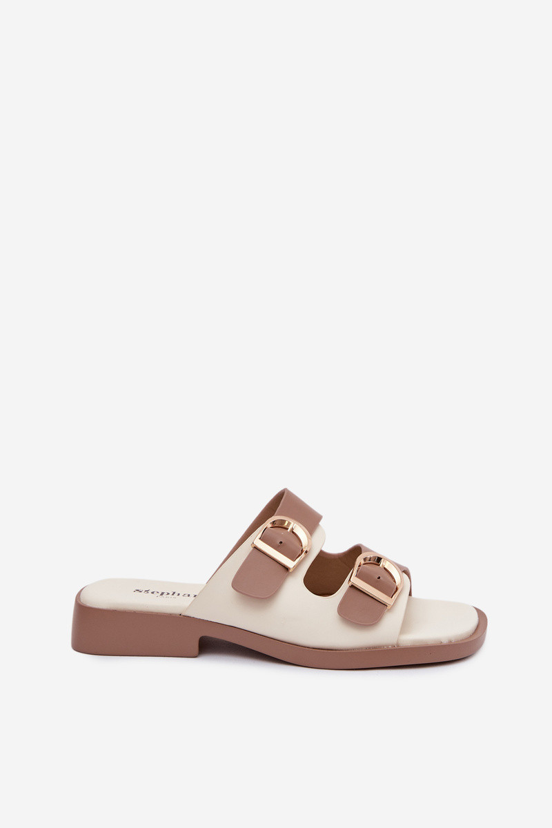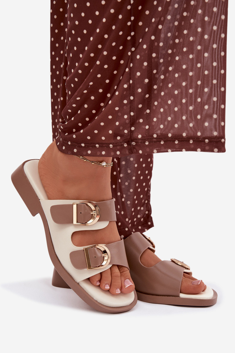 Damen-Pantoletten in Goldfarbe mit sandfarbenen Schnallen