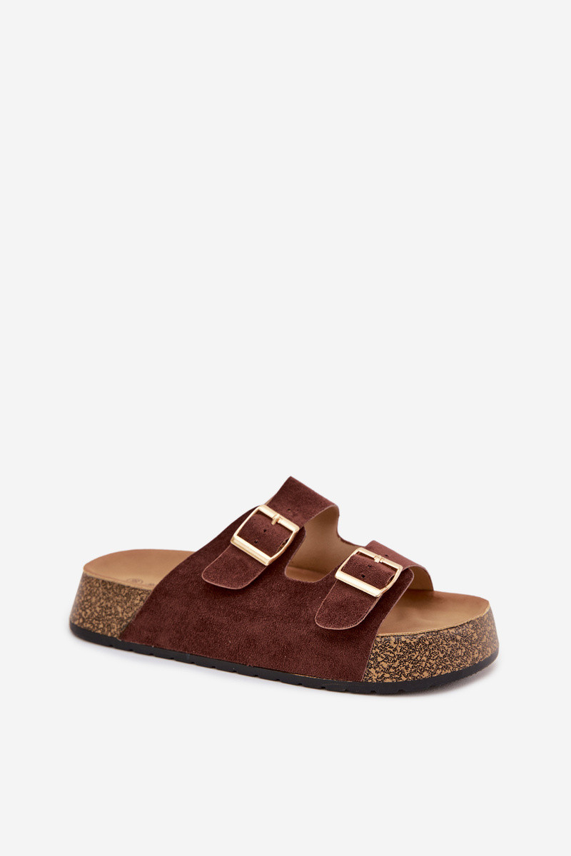 Braune Damen-Pantoletten mit Plateausohle und goldfarbenen Schnallen „Tovessa"