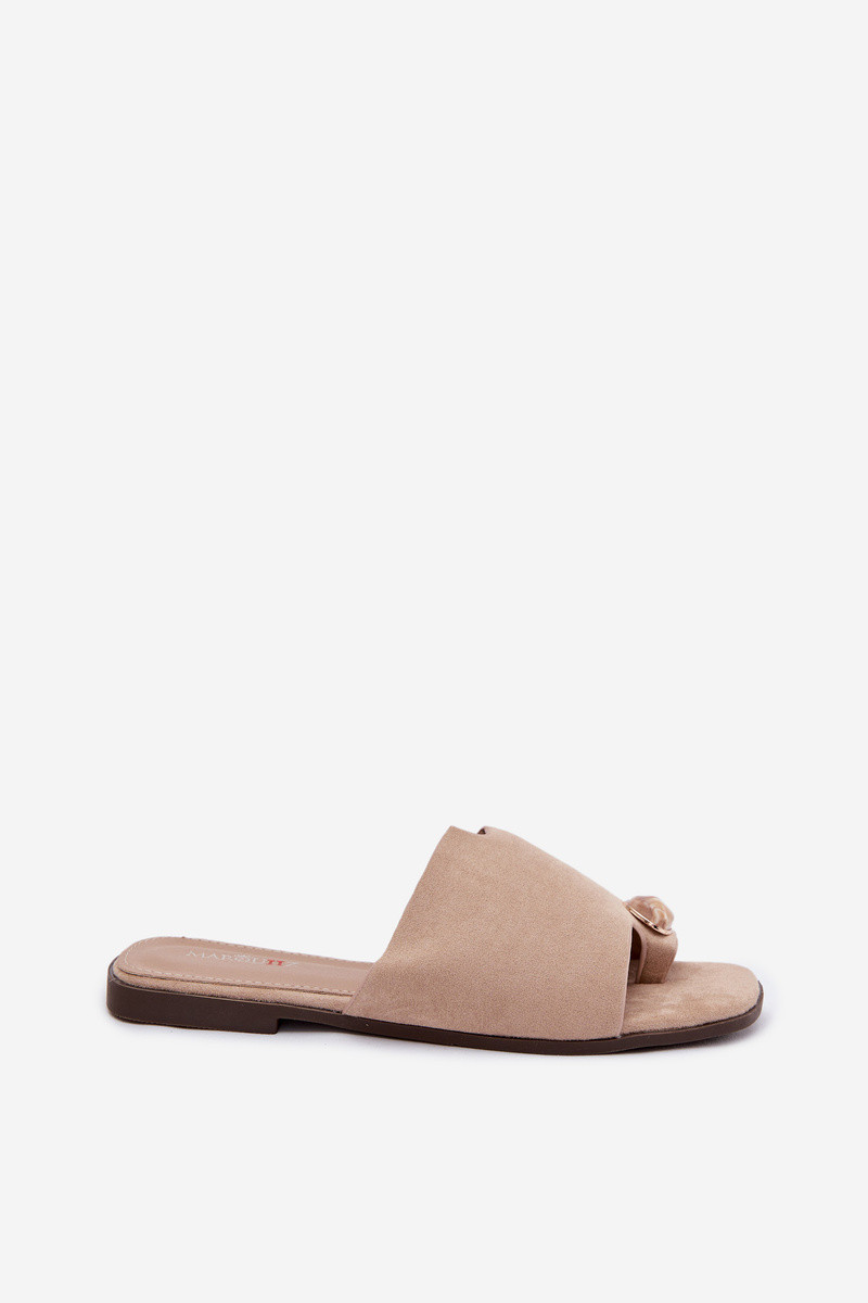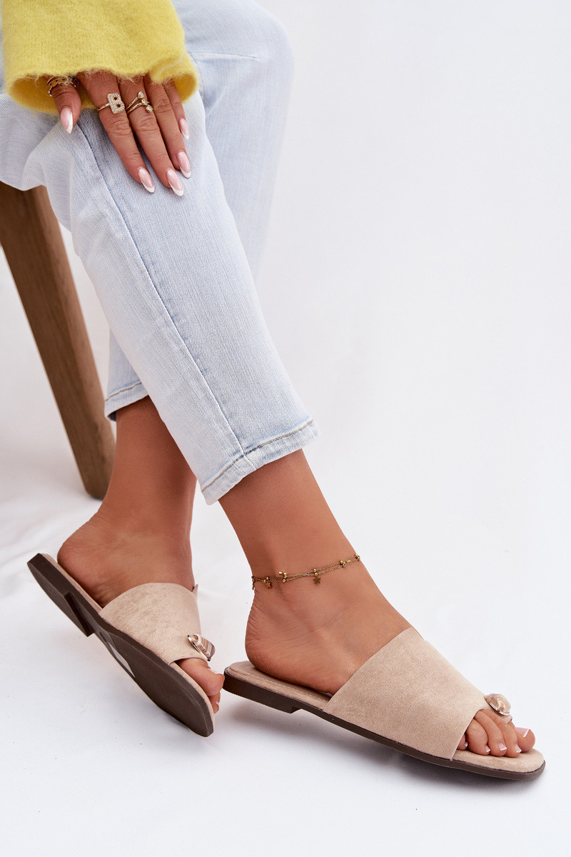 Damen flache Pantoletten mit dekorativen Details aus Kunstvelours, sandfarben, Selavine