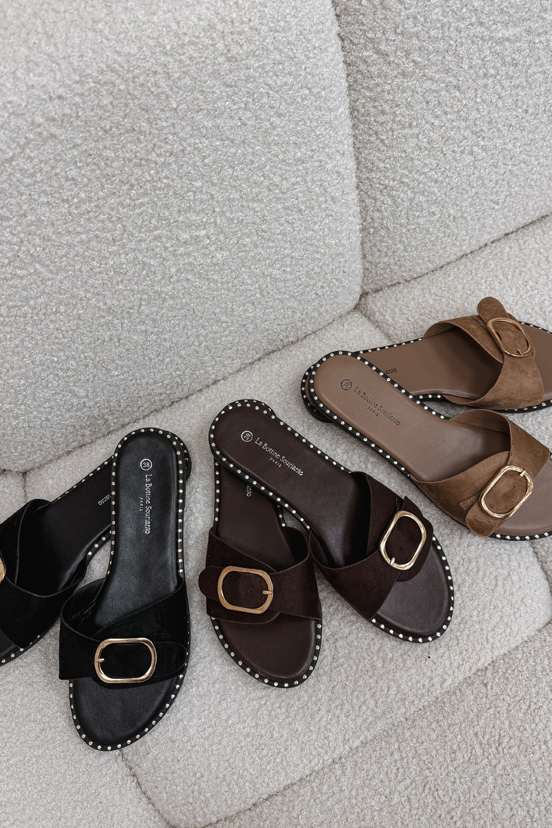 Damen Pantoletten mit breiten Absätzen und goldenen Schnallen in Schwarz Selivelle