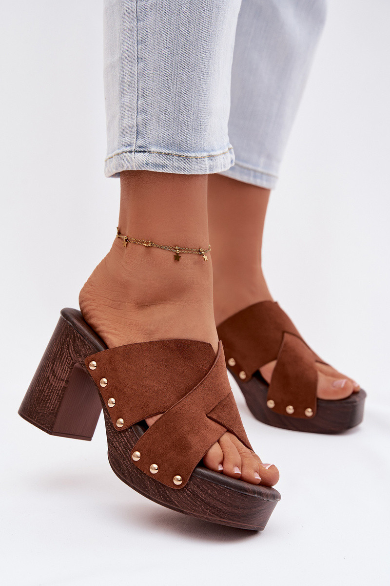 Damen Pantoletten mit Absatz und goldfarbener Verzierung in brauner Nerelle