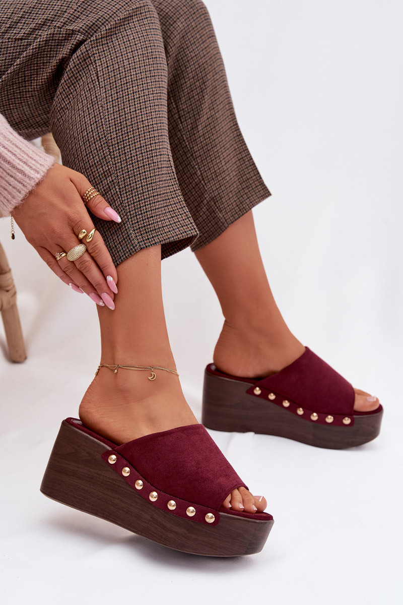 Damenhausschuhe Auf einem Keil Ze goldene Farbemi Stollen aus Öko-INildlederoZue Burgund Helivina