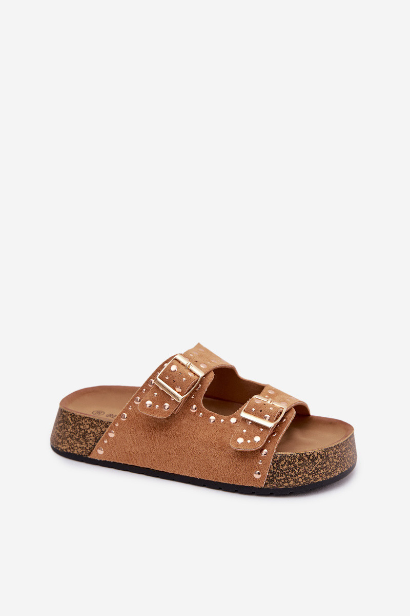 Damenhausschuhe Ze goldene Farbemi mit Schnallenmi Und Stollen braune Farbe Tervina