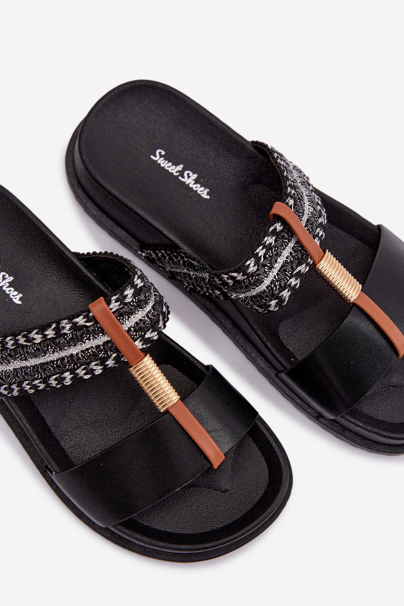 Damen-Pantoletten mit Plateau und Riemen sowie goldfarbigen Details, schwarz, Tahlia