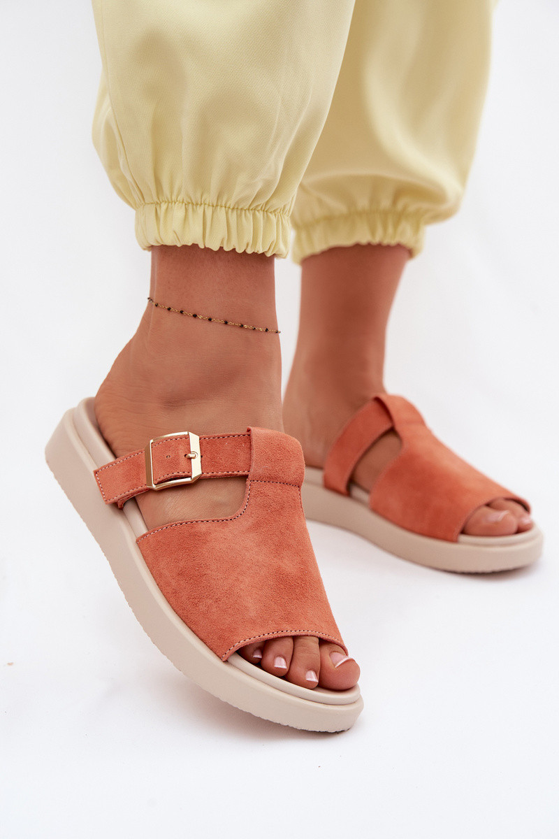 INildleder-Hausschuhe für Damen mit einer Plattform mit goldenen Schnallen orange Farbe Zemela