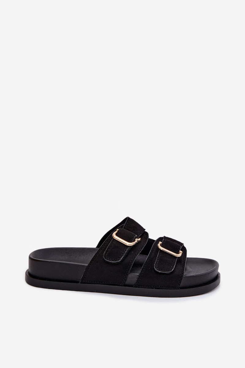 Schwarze Slipper mit goldenen Schnallen Pelorin
