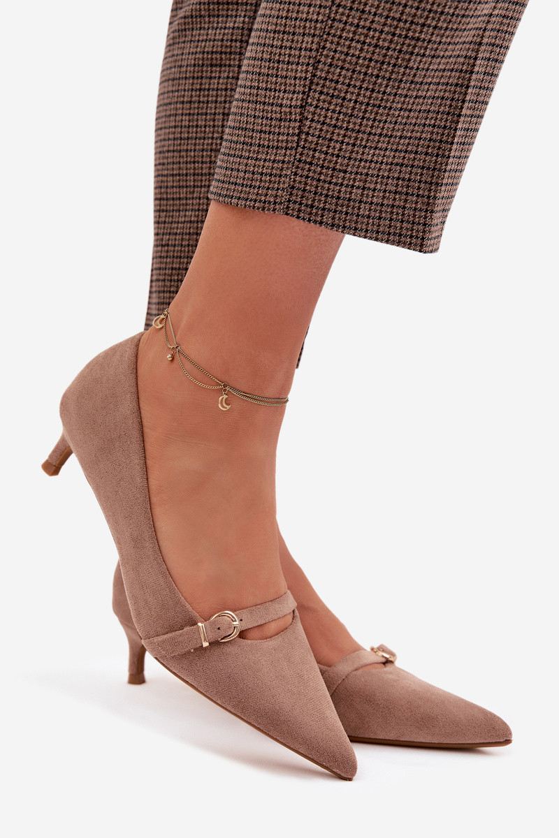 Damen-Schuhe mit niedrigem Absatz und dekorierten Absätzen in Sandfarbe Pirela