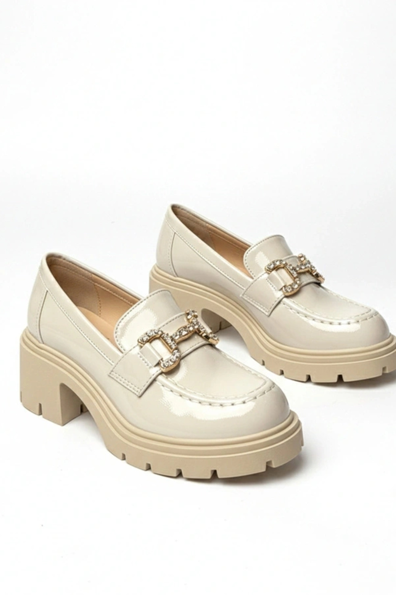 Cremefarbene lackierte Mokassins mit Absatz und Zirkonia Paola