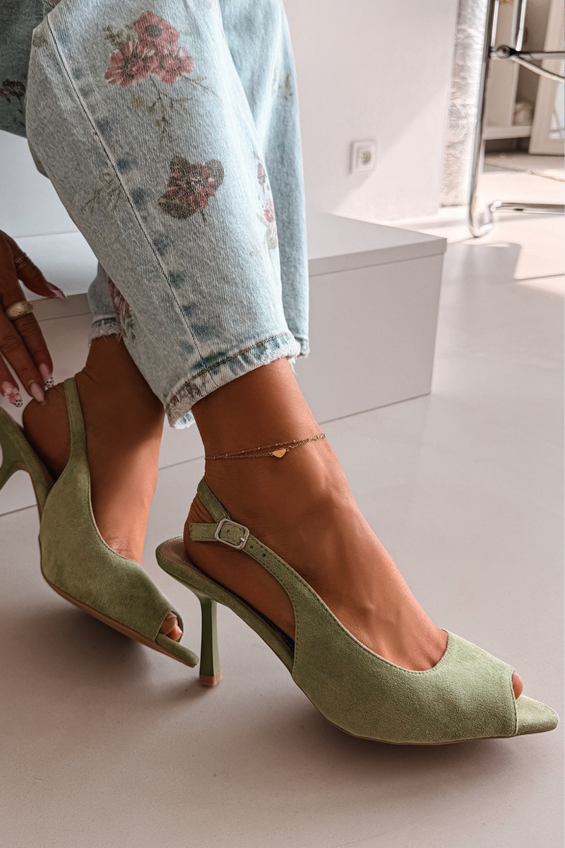 Damensandalen mit dünnen Absätzen aus Öko-INildlederoZue grüne Farbe Sevina