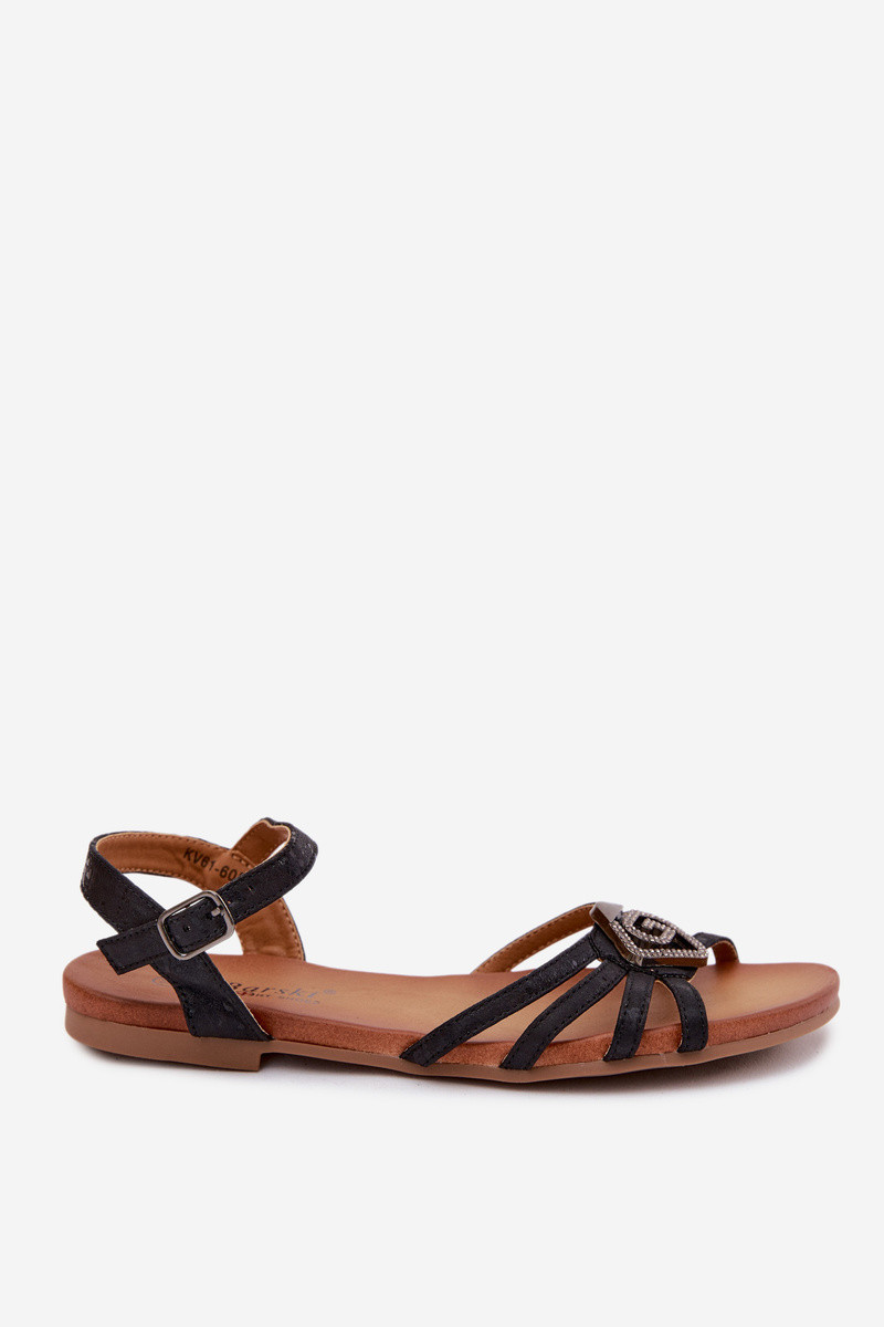 Flache Sandalen für Damen mit Riemen und Dekoration S.Barski KV61-6056 schwarz