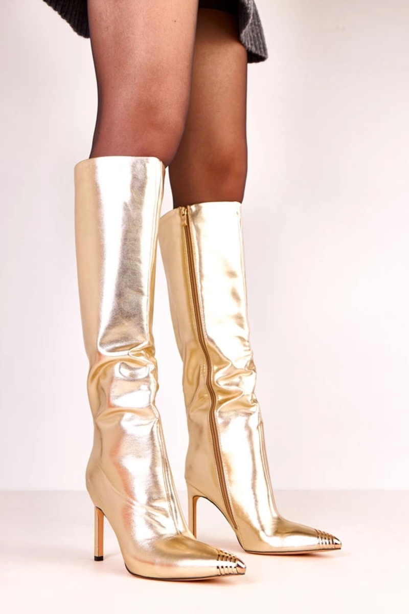 Goldene elegante kniehohe Stiefel mit metallischer Spitze Janisa