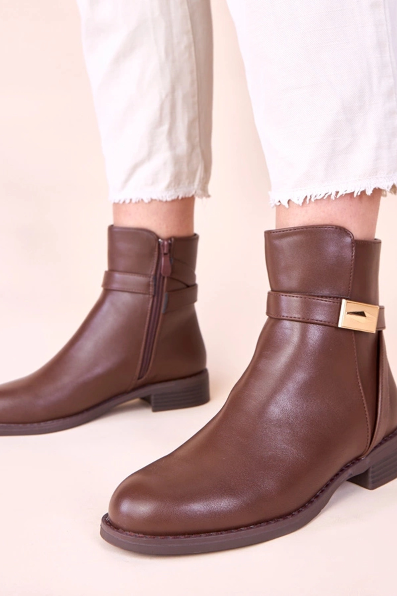 Braune klassische Stiefeletten mit goldenem Schmuck am Riemen Nefera