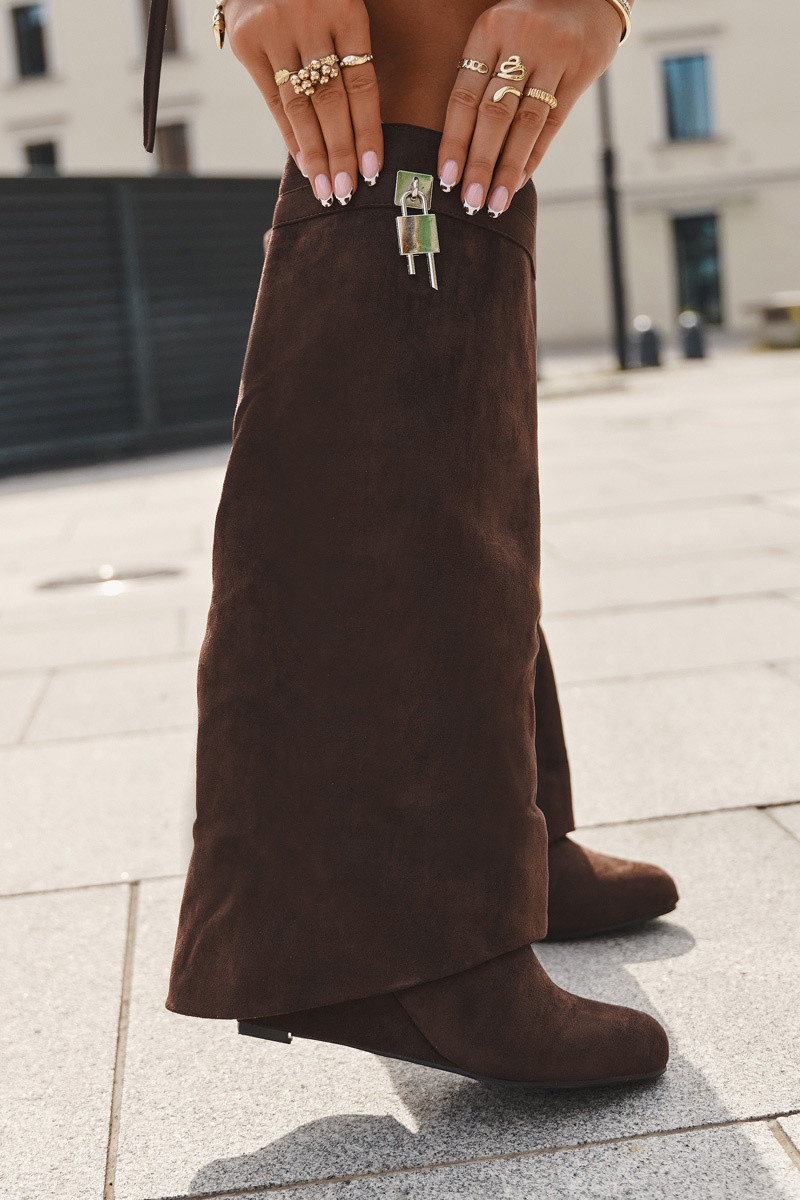 Damen-Stiefel mit Plattform, Riemen und silbernen Details in schokoladenbrauner Farbe Korivelle