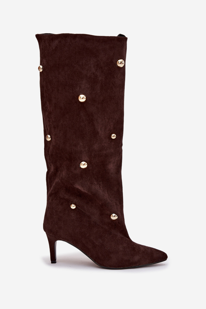 Schokoladenfarbene Slipper-Stil Damen-Overknee-Stiefel mit dünnen Absätzen und goldenen Verzierungen Thaliane