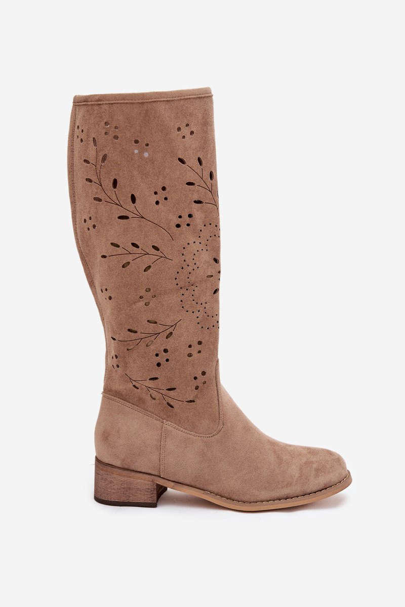 Sandfarbene Damen überknie Stiefel mit durchbrochenen Elementen Helinna
