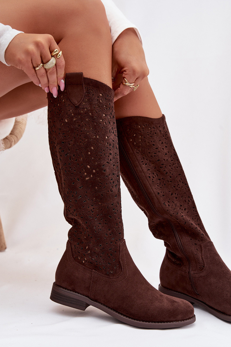 mit durchbrochenen Elementen Damenstiefel mit breiten Absätzen S.Barski HY61-8023 CzekoladoZue