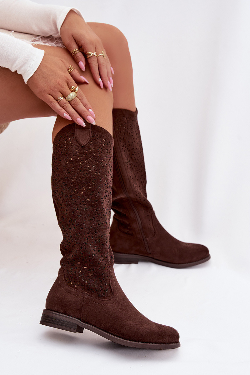 mit durchbrochenen Elementen Damenstiefel mit breiten Absätzen S.Barski HY61-8023 CzekoladoZue