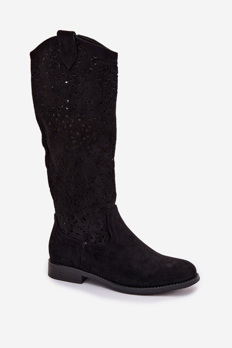 Damen Stiefel mit Lochmuster und breiten Absätzen S.Barski HY61-8023, schwarze Farbe