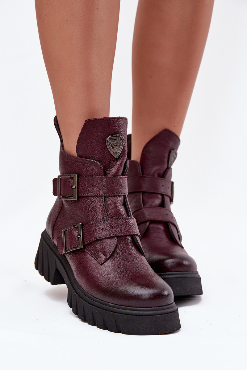 Zazoo 60482 bordeauxfarbene warme Leder-Stiefeletten für Damen mit Schnallen und dekorativen Details