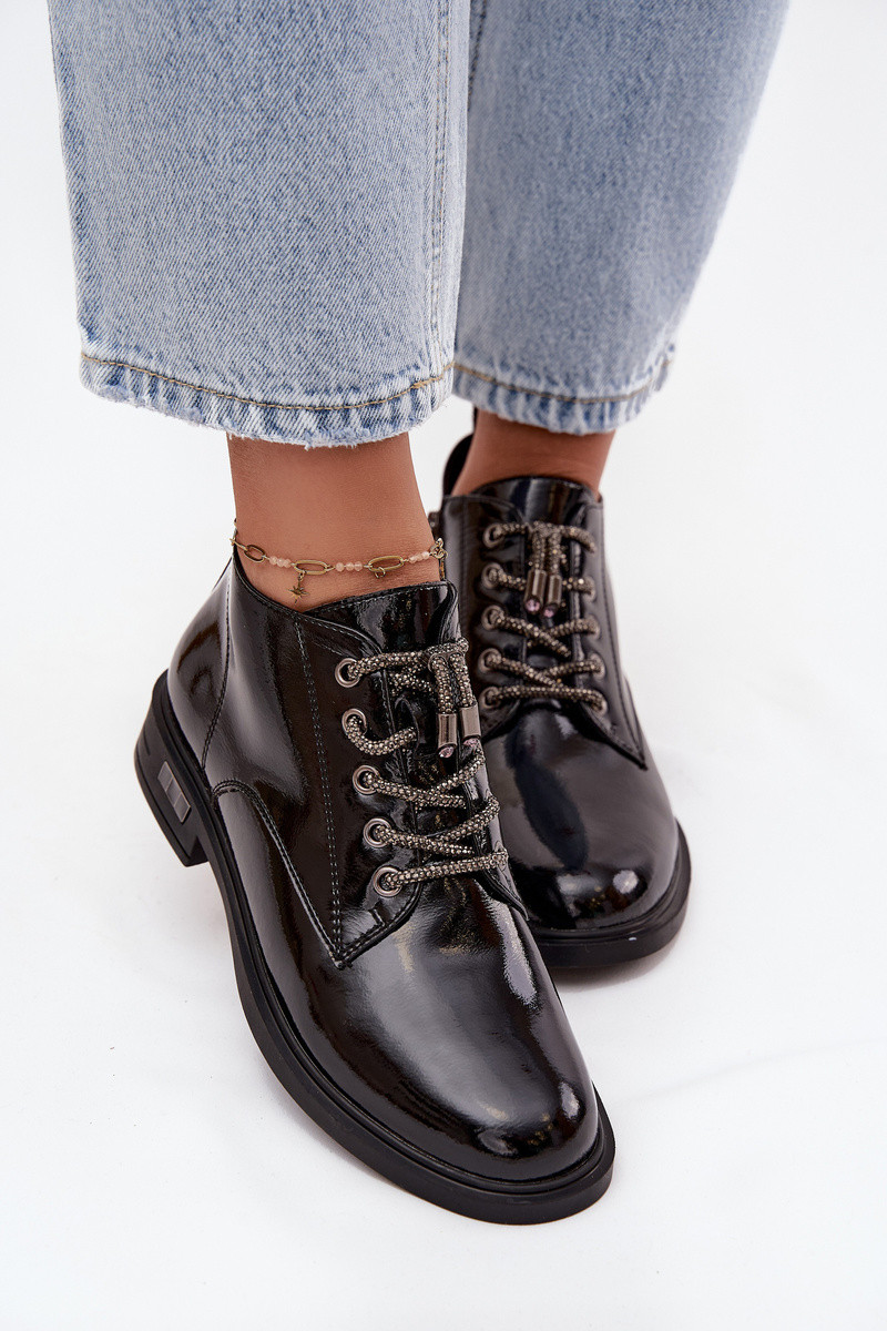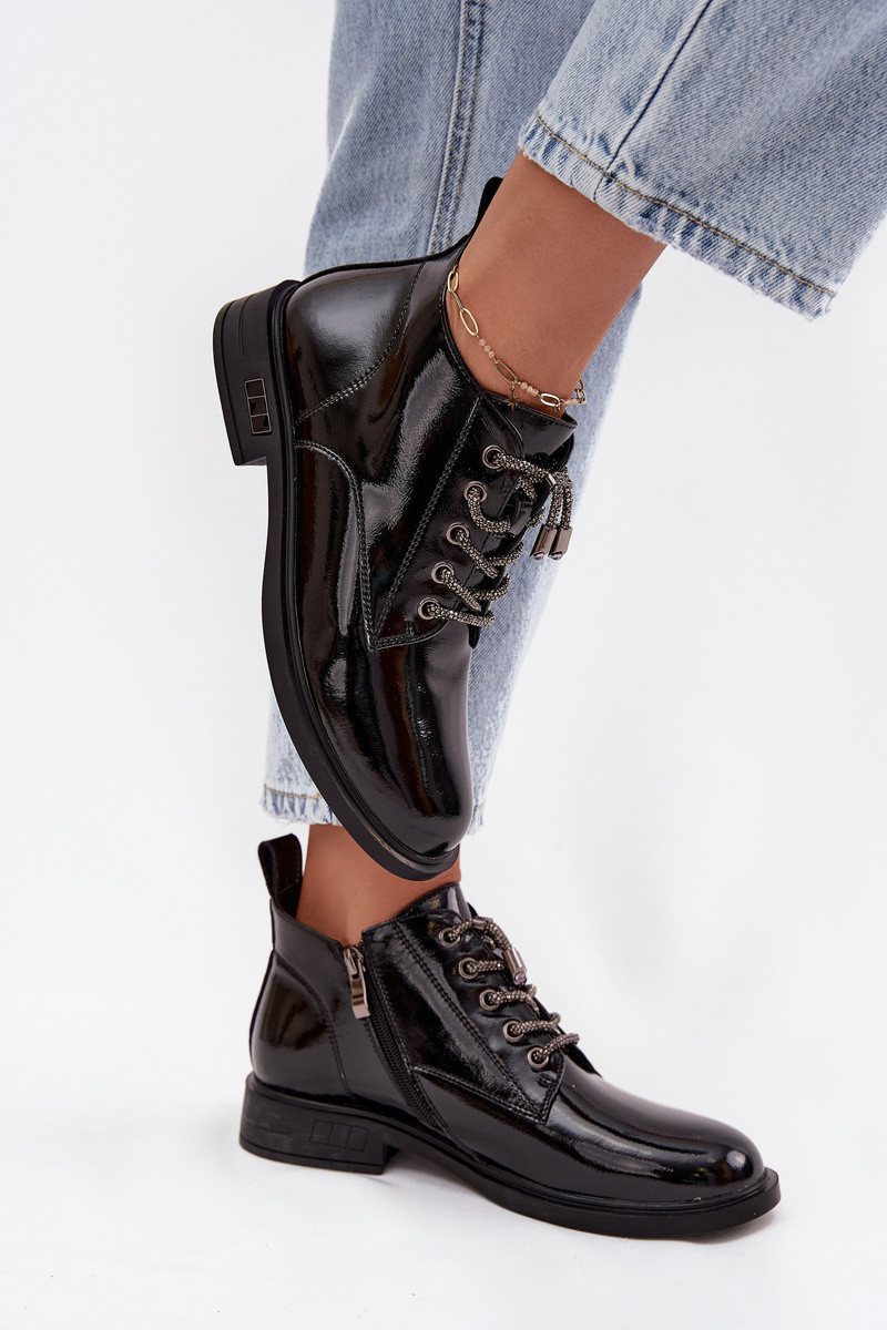 Haut mit Lackeffekt Damenstiefel Mit Dekorationen Schnürungm D&A MR52-124 schZuarze Farbe